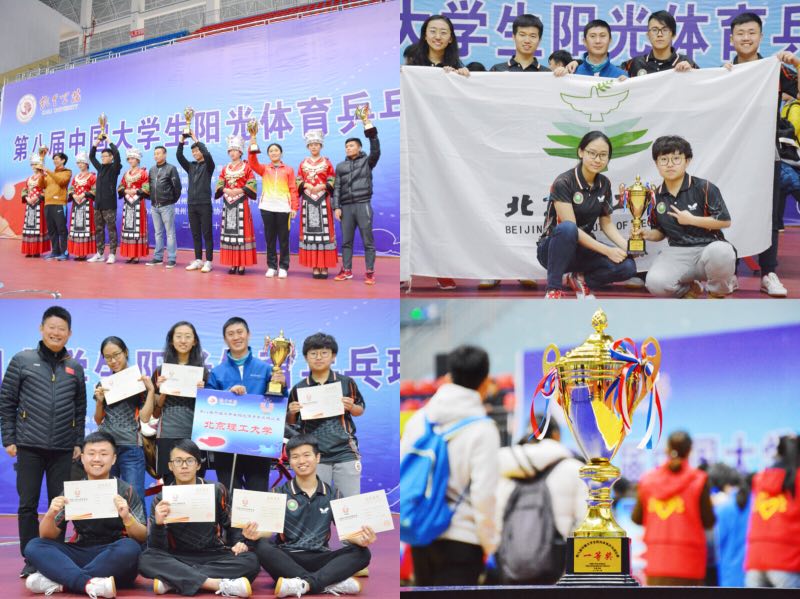 本次比赛的竞赛项目为男女混合团体对抗赛,来自全国各地的32个代表队参加了比赛。我校代表队由教练员李京生,学生陈晨,周亦楷,董智源,杨柳,刘皓欣,李昕颖组成。虽然这是我校第一次参加中国大学生阳光体育乒乓球比赛,但大家互相鼓励,不懈拼搏,取得了第一名的好成绩。