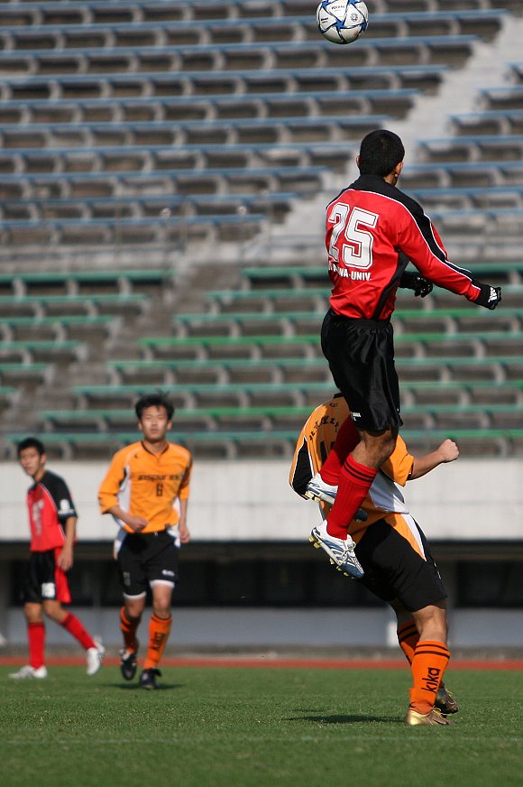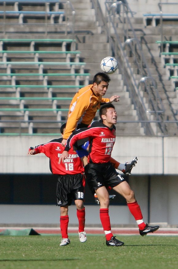 驹泽大学足球队的队员虽然平均身高不及我校足球队,但其在非常积极拼抢的同时,争抢头球也都采用助跑的方式,反而能将大部分头球从我队队员头顶抢走,这点的确值得我们学习。