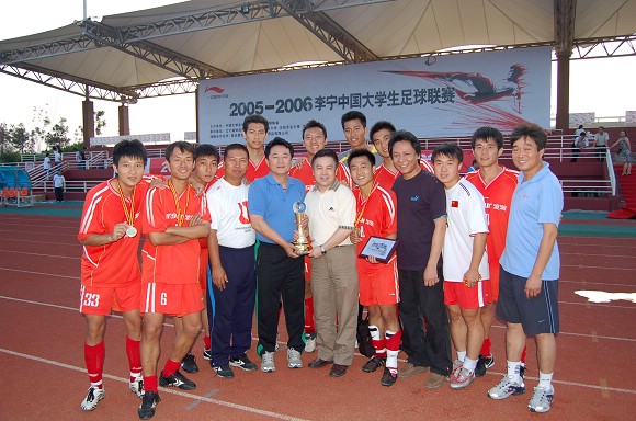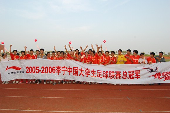 7月8日下午,在沈阳建筑大学体育场举行的2005~2006李宁中国大学生足球联赛的冠亚军决赛中,我校足球队不畏强手,以5:2击败本届联赛最大的黑马队伍——太原理工大学队,以一场精彩绝伦的进球大战重新夺回全国大学生联赛总冠军奖杯!