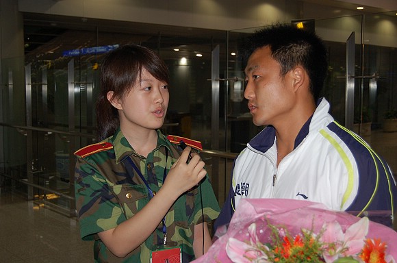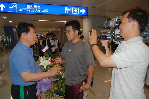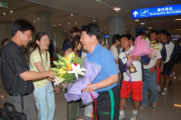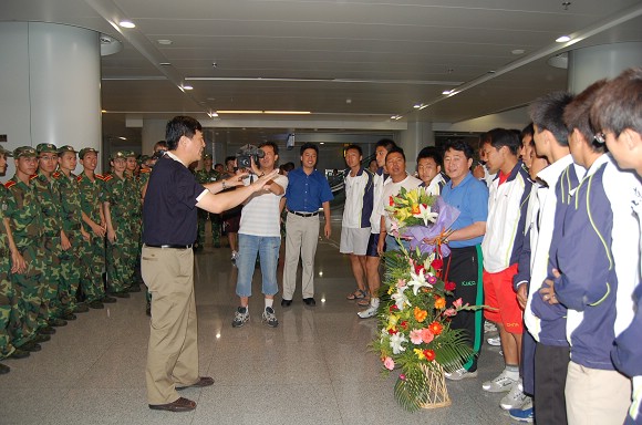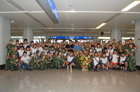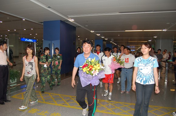 在首都机场候机厅,足球队全体教练员和运动员受到了师生员工代表的热烈欢迎!