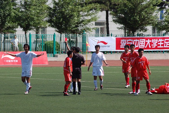 6月28日,李宁杯第六届中国大学生足球联赛决赛阶段的比赛在辽宁沈阳正式开战,我校足球队(着红色队服)在小组赛中首战面对青岛大学足球队。由于我校足球队曾连续获得三届联赛冠军,今年又首次参加全国职业足球乙级联赛且战绩辉煌,使得各队都非常重视与我队的比赛。
