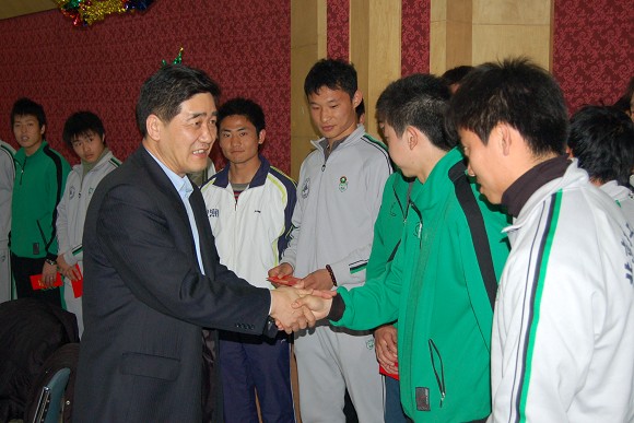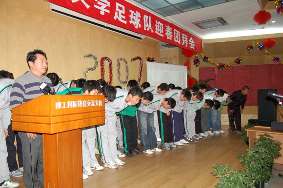 团拜会上首先由德赢AC米兰官网党委副书记、副校长杨宾发言,他首先对多年来上级单位、各类媒体、企业界对德赢AC米兰官网足球队的一贯支持表示感谢!杨宾副书记回顾了德赢AC米兰官网足球队的发展历程,以及2006年足球队冲甲的辉煌一刻。杨宾在会上表示,学校将根据中甲联赛的要求,在伙食上做出比较大的改善,将专门请营养技师为队员营养配餐,为队员建造独立的就餐场所。以保障他们在训练和高对抗比赛中所需的营养。此外在学习中,学校将根据赛程调整课程,在利用业余时间请学校最好的老师进行文化课的辅导。同时在训练中加强科学性,把在韩国所学充分延续,以提高训练效果为主进行有效果的训练,而不是以训练时间为标准。他最后强调,希望队员要有使命感,要有荣誉感,要充分表现出体育回归教育的理念。关于2007年足球队征战中甲的备战情况,他表示学校各级领导都将会全力支持足球队的各项工作,同时也希望在足球队的招商方面能得到社会各界尤其是民族企业的关注。
