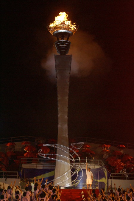 开幕式随着大运会火炬的点燃而达到高潮。特别是当第28届奥运会跳水男子双人跳台冠军、广东籍选手杨景辉从主席台跑向神圣的火炬台,点燃以“书”堆砌的高耸云天的火炬时,引发了全场的欢呼和热烈掌声。最后在激昂的歌声中,激光射向全场,瀑布焰火飞流直下。熊熊的圣火照亮广州夜空,台上台下运动员和大学生观众激情互动。