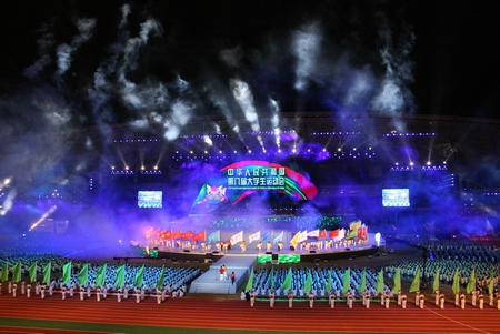在整台文体表演中,大学生既是观众又是演员,台上台下激情互动。硕大的舞台四面延伸,与互动观众连接,激光、轨道、特技等元素渲染互动气氛。在序曲《青春起飞》中,近四万名大学生观众分不同色块,与台上交相辉映;在《我的舞台》表演中,数千名大学生从表演区两侧激情奔出,就像艺术体操健儿抛出的两条彩带,绚丽多姿又富动感,在属于自己的舞台上,编织青春之梦。