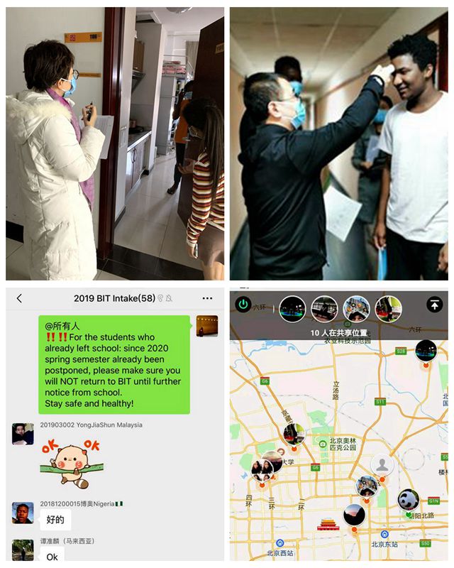 及时宣传引导。针对留学生群体的特殊性,学校着力做好宣传引导工作。留学生中心通过微信公众号、学生通知群等网络渠道,向学生及时发布官方通知信息和安全防护提示,宣传普及疫情防治知识和防控要求,强化健康教育、提高防范意识。“留学北理”微信公众号累计发布(含转载)近20条、精心翻译重要通知消息10余条,向学生微信群发布通知100余次。中心还撰写发布《致北理工全体国际学子的一封信》,温馨提示全体留学生服从学校安排、科学做好防护、确保健康平安,制作了通知延期开学的电子调查问卷及时收集学生反馈,确保每一名在籍留学生知晓延期开学并承诺不提前返校,回收率达100%。