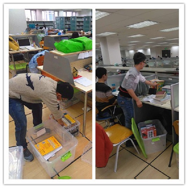 为了解决这一问题,图书馆当即提出解决方案:将图书馆三、四层设为考研复习专区,并采购500个收纳箱借给考研学生使用,要求同学们将书本等物品收纳在箱内,人走时将收纳箱放在椅子下或桌子底下,起到“人走桌空,杜绝占座”的作用。11月的两个周末读者服务部工作人员加班加点,把500个收纳箱发到考研学生手中。