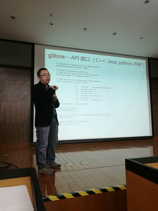 北京大学邹磊博士(2016年国家自然科学基金优秀青年基金获得者)做了“基于图的RDF知识图谱数据管理”报告。他为师生介绍RDF知识图谱数据背景和大规模RDF知识图谱为目前数据管理领域带来了新的挑战和机遇,如RDF数据的存储和查询,面向知识图谱的推理和挖掘,交互式RDF数据检索和浏览平台等等。