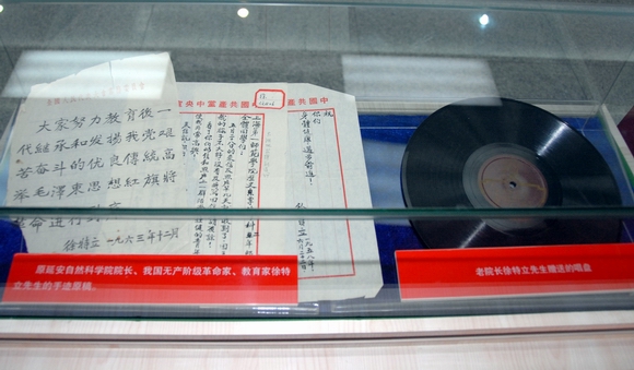 中国无产阶级革命家、教育家、原延安自然科学院院长徐特立先生的手迹原稿和他捐赠的唱盘。