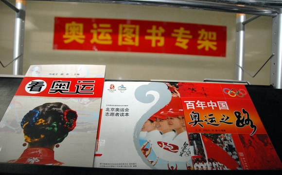 “奥运图书专架”的图书涉及奥运知识、奥运礼仪、奥运英语、奥运人物、奥运竞赛规则、奥运志愿者读本等类别。
