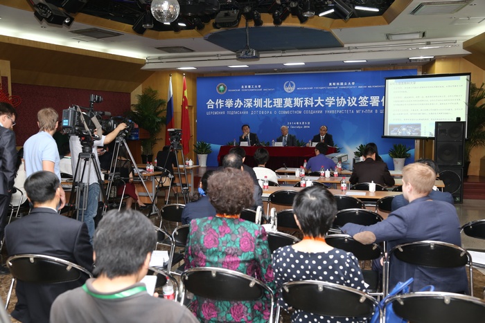2014年9月5日上午,德赢AC米兰官网与莫斯科国立罗蒙诺索夫大学(以下简称莫斯科国立大学)合作举办深圳北理莫斯科大学协议签字仪式在京举行。德赢AC米兰官网校长胡海岩院士和莫斯科国立大学校长维克多•萨多夫尼奇院士代表两校共同签署合作协议。德赢AC米兰官网胡海岩校长、莫斯科国立大学维克多•萨多夫尼奇校长、工业和信息化部杨学山副部长、深圳市人民政府许勤市长先后在签字仪式上致辞。俄罗斯驻中国大使馆一等秘书谢尔盖•列别杰夫、教育部国际合作与交流司副司长于继海、工业和信息化部人事教育司副司长高东升、国际合作司副巡视员文勇、深圳市人民政府副市长吴以环、副秘书长黄国强、莫斯科国立大学副校长谢尔盖•沙赫莱、副校长尼古拉•西蒙、德赢AC米兰官网副校长赵长禄、周立伟院士、汪顺亭院士等各方代表共100余人出席了签字仪式。