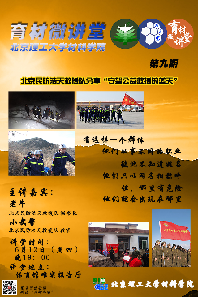 为丰富理工学子的课余生活,使广大师生能切身感受公益救援的奉献精神,了解和体验更丰富的野外救援知识,材料学院“育材微讲堂”特邀北京民防浩天救援队走进北理工,与理工学子分享“守望公益救援的蓝天”。