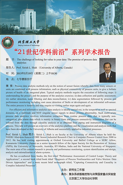 报告人:Sirish L. Shah 教授 (加拿大阿尔伯塔大学)