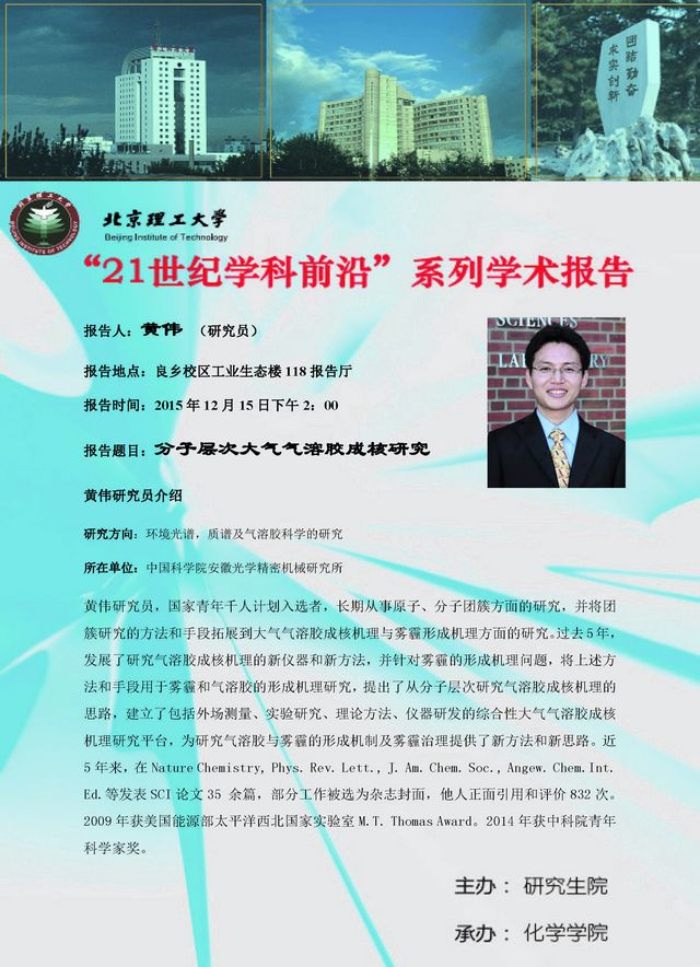 【化学学院】“21世纪学科前沿”黄伟研究员学术报告通知