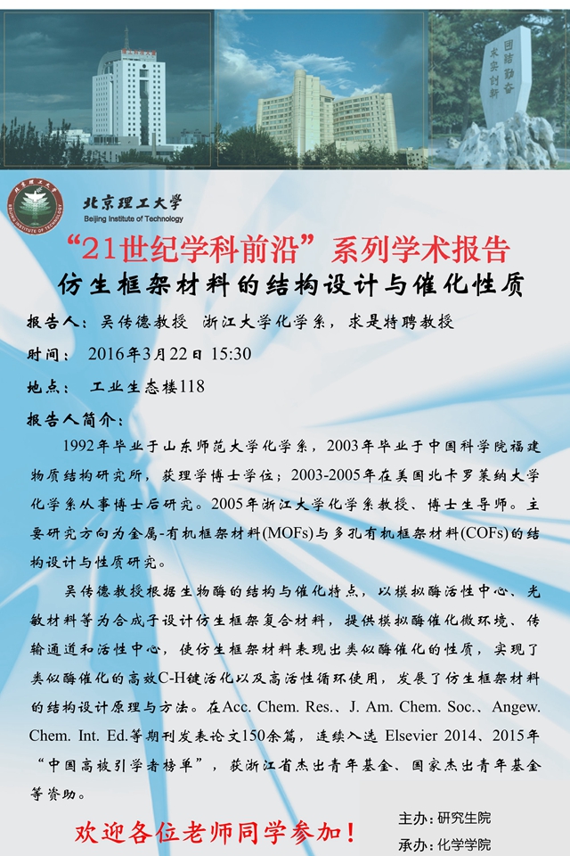 【化学学院】“21世纪学科前沿”吴传德教授学术报告通知
