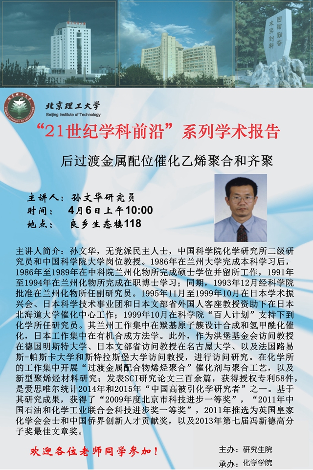 【化学学院】“21世纪学科前沿”孙文华研究员学术报告通知