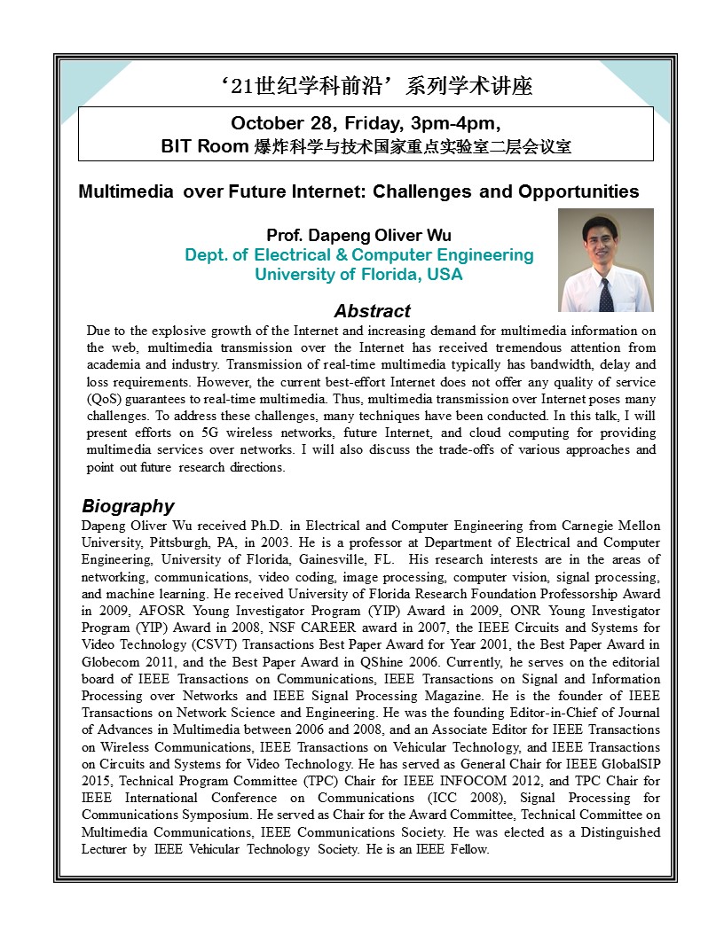 【机电】“21世纪学科前沿”系列学术讲座—Multimedia over Future Internet: Challenges and Opportunities