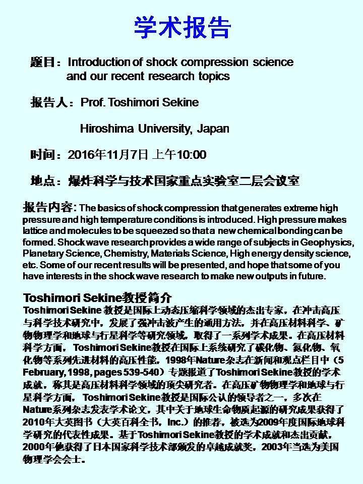 广岛大学Toshimori Sekine教授学术报告预告预告