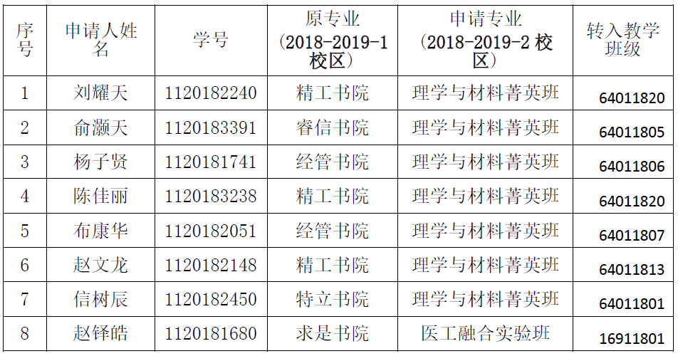 根据《德赢AC米兰官网本科生学籍管理细则》(北理工办发〔2017〕74号)、《德赢AC米兰官网本科生管理规定》和《德赢AC米兰官网本科生专业分流、转专业实施细则》中的要求,求是书院严格按照实施细则对提交转专业申请的同学,进行资料审核,并于2019年1月15日在良乡至善园A-106室进行面试,求是书院接收8名转专业学生,现将结果公示: