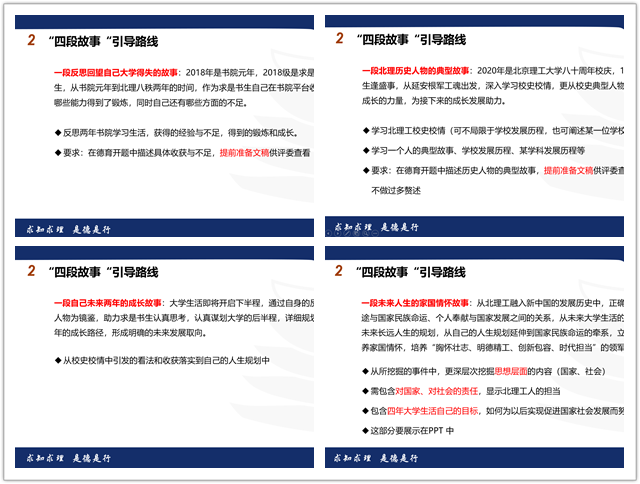一段反思回望自己大学得失的故事、一段北理历史人物的典型故事、一段自己未来两年的成长故事、一段未来人生的家国情怀故事。