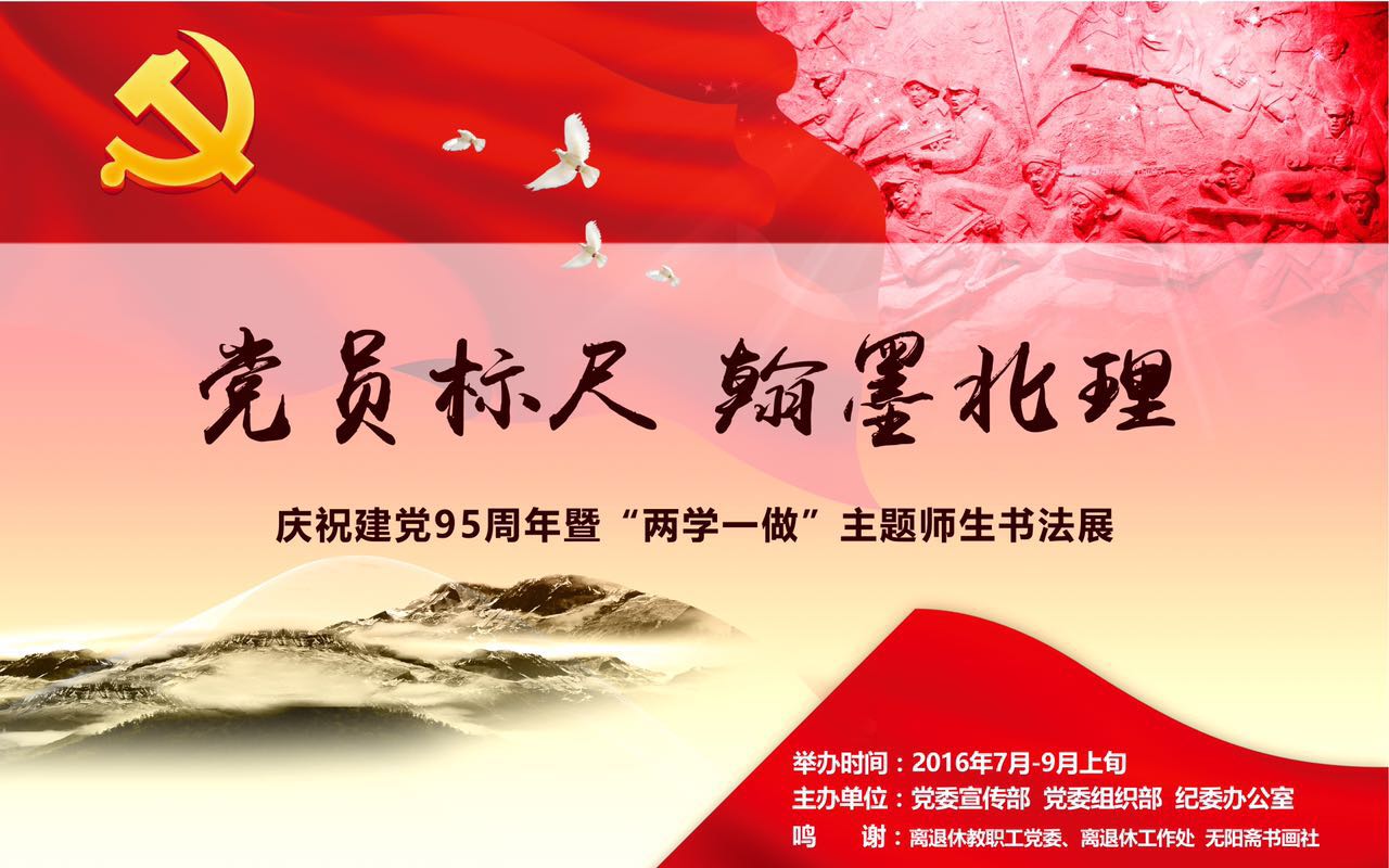 为纪念中国共产党成立95周年,深入扎实开展“两学一做”学习教育,校党委宣传部、党委组织部与纪委办公室将联合举办“党员标尺 翰墨北理——建党95周年暨‘两学一做’主题书法展”。本次展览得到了离退休教职工党委、离退休工作处以及无阳斋书画社的大力支持。