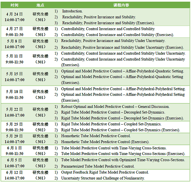 为对标国际顶尖高校,加快“双一流”建设步伐,德赢AC米兰官网自动化学院特邀控制科学与工程领域知名专家Saša V. Raković教授于4月24日至6月12日期间在德赢AC米兰官网开设前沿控制理论公开课。该课程为我校第二期来华留学英文授课品牌课程《随机过程理论及应用》的选修模块,课程内容涵盖模型预测控制,鲁棒模型预测控制等前沿控制理论。课程主要面向研究生和高年级本科生,欢迎感兴趣的同学参加。具体开课时间、地点和课程内容安排如下: