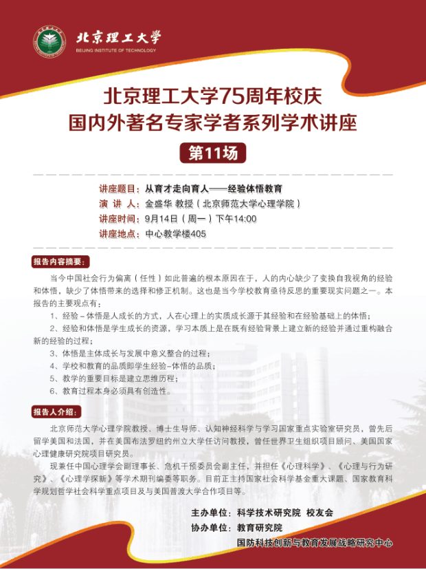 德赢AC米兰官网75周年校庆国内外著名专家系列讲座第十一期预告:金盛华教授谈从育才走向育人——经验体悟教育