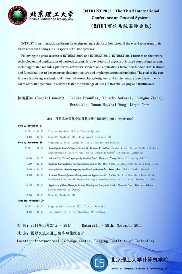 德赢AC米兰官网计算机学院主办并承办的第三届可信系统国际会议(INTRUST 2011)将于2011年11月27到29日在德赢AC米兰官网国际交流中心召开,会议录用22篇论文,并在28日邀请到了Graeme Proudler、Moti Yung、Kouichi Sakurai、毛文波、张焕国、Yanan Hu等6位际、国内顶级专家给大会做特邀报告,会议内容涉及可信计算、安全协议、云存储安全、无线安全等领域内容。邀请感兴趣的师生积极参与。