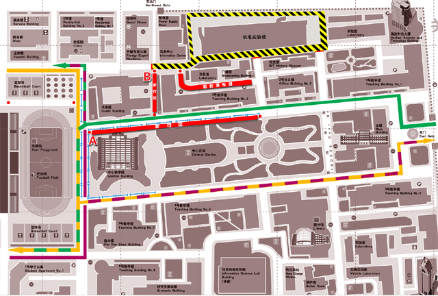 结合机电实验楼周边道路现状以及周边现有停车密集程度,在尽可能保障车辆顺畅通行的前提下,最大程度达到出入便捷,同时,考虑广大师生的出行安全,进一步增设校园步行区,并充分发挥其作用。具体区域路段为:A中心教学楼西北路口沿教学北路至3号教学楼东南路口(一半道路);B求是楼东面路段和三号教学楼北面路段。由于考虑三号教学楼北面现有停车场使用频率较高,在此次道路施工完毕前仍作为“暂时停车场”,处于半封闭状态。当正式启用机电实验楼周边道路时,三号教学楼北面现有机动车均可停放于机电实验楼地下停车库及地面停车场。借此,三号教学楼北面将成为完整的步行区。(具体交通流向请参阅示意图)