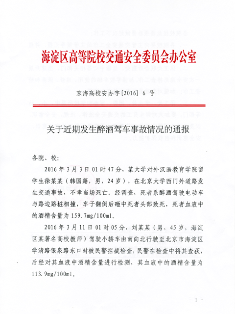 为预防和减少因酒驾导致的道路交通事故,现转发海淀区高等院校交通安全委员会办公室《关于近期发生醉酒驾车事故情况的通报》(京海高校办字[2016]6号),请各学院、部、处组织所属师生员工、驾驶员做好以下工作: