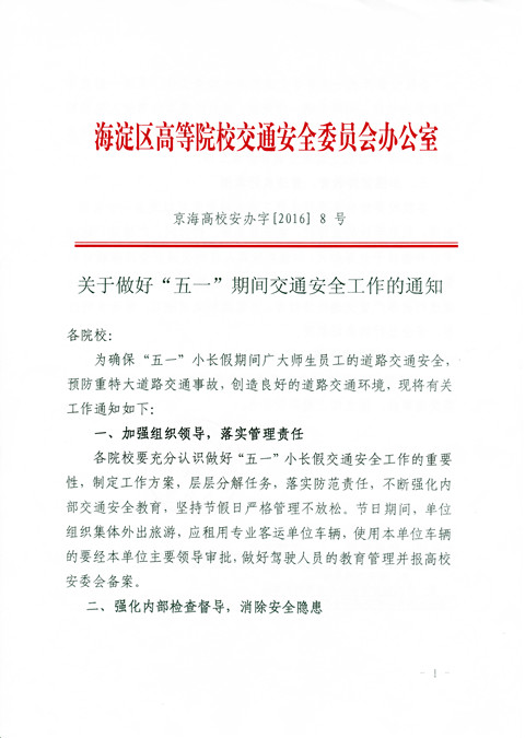 根据海淀区高等院校交通安全委员会办公室《关于做好“五一”期间交通安全工作的通知》(详见附件)要求,为切实做好“五一”期间的交通安全工作,确保广大师生员工假期的交通安全,请各学院、部、处做好以下工作: