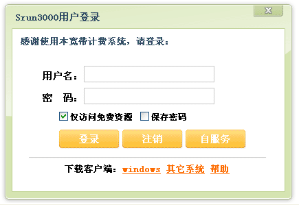 6、使用新系统时,如发生未能正常离线的情况,此时要想退出在线状态,即类似原计费系统“强制离线”功能,可进入新计费系统的登录界面(http://10.0.0.55),在“Srun3000用户登录窗口”(见下图)中输入用户名和密码,然后点击“注销”按钮即可。