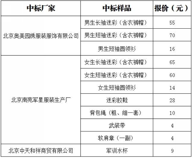 2015年学生军训用品中标金额分别为,男生军训用品共计196元,女生军训用品共计194元。特此公示。