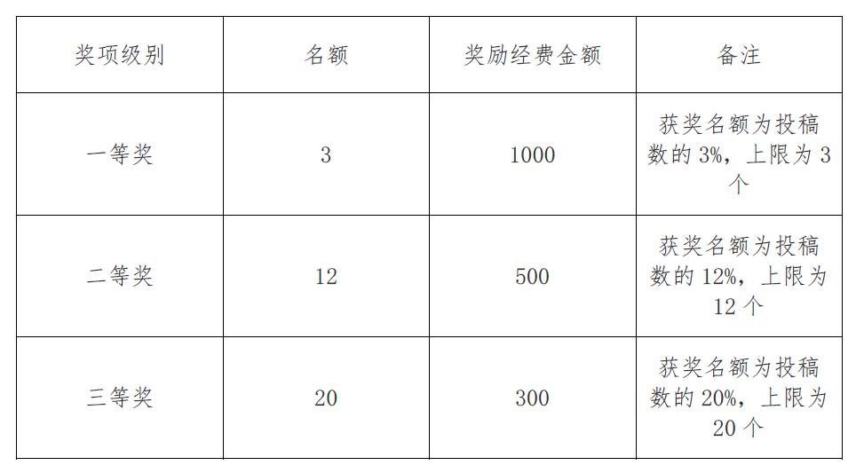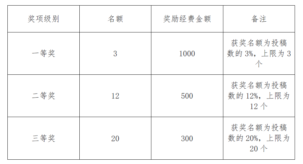 1.本次比赛按教工组和学生组两类进行分组评比,每组分别设置一、二、三等奖若干,发放荣誉证书并给予奖励,奖励标准见下表: