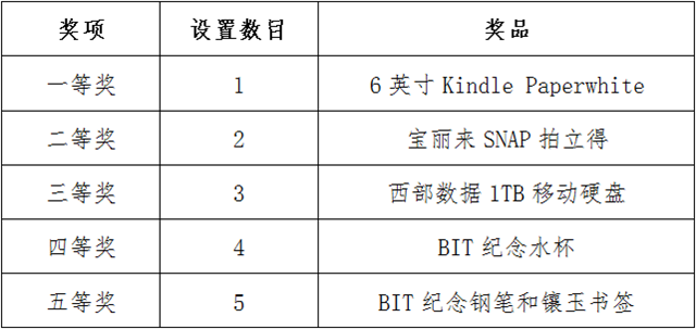 本次活动将评选出一、二、三、四、五等奖,奖项及奖品设置如下: