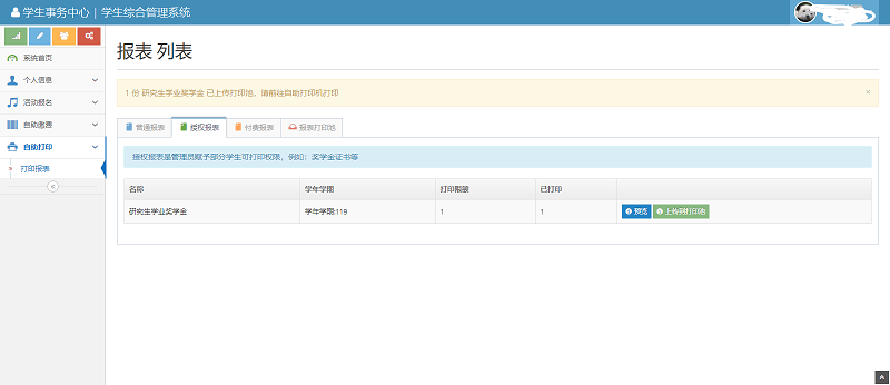 第一步: http://ssc.info.bit.edu.cn/单点登录,进入如下界面,点击自助打印——打印报表——选择要打印的奖项上传到打印池;