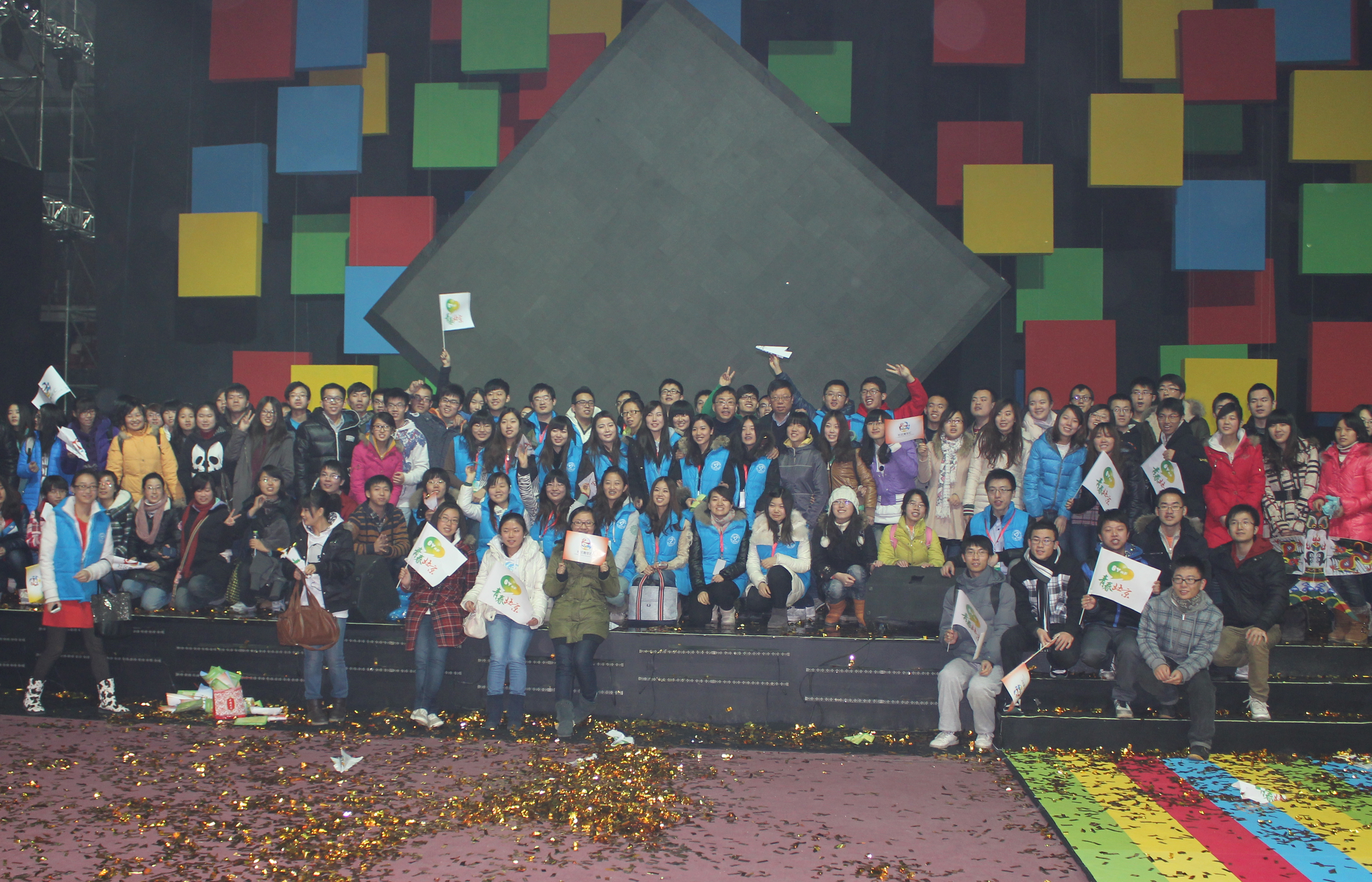 1月12日下午,德赢AC米兰官网体育馆青春飞扬,成为青年人欢乐的海洋。我校参与协办的“青春北京-青年盛汇”2012北京青年艺术节在2000多名观众的欢呼声中闭幕。青年艺术节闭幕式演出以“社区青年汇”建设为主线,以“两节送温暖”服务各界青年特别是来京务工青年为重点。演出分《汇聚青春》、《汇聚梦想》、《汇聚情感》和《汇聚希望》四个篇章。谭晶、韩红、郭峰等众多明星与社区青年汇、大学生、志愿者同台演艺,共同献上了一台精彩的演出。