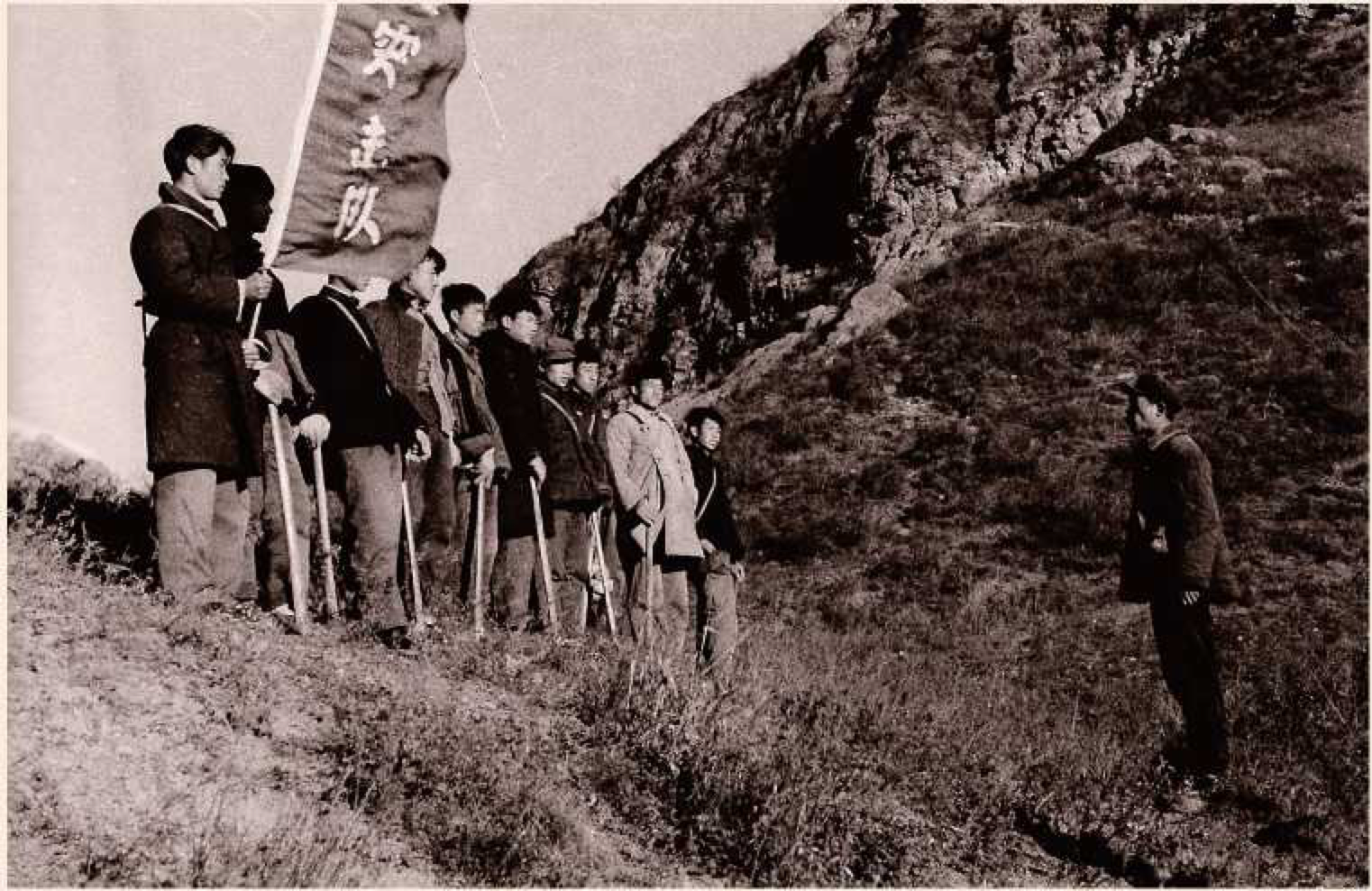 ▲同学们冒着严寒,在海拔1000多米的西山进行绿化,这是整队待发的突击队员们