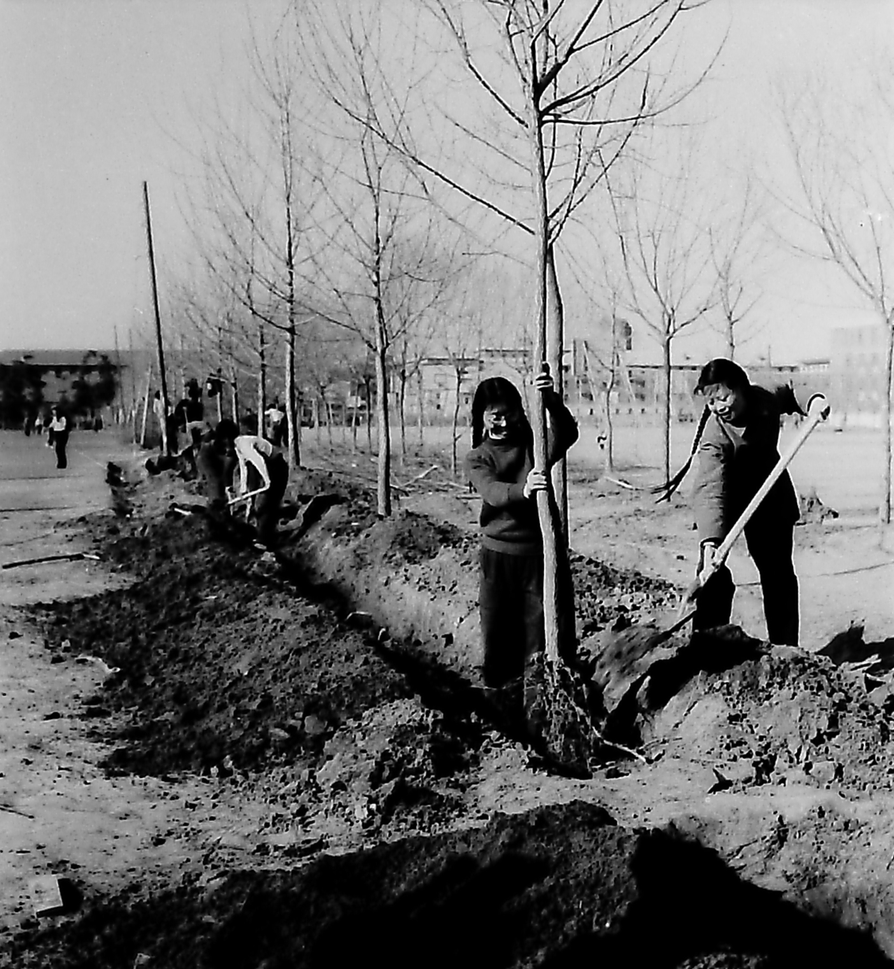 用自己的双手把学校建设得更加美丽。 这是同学们正在校园中植树