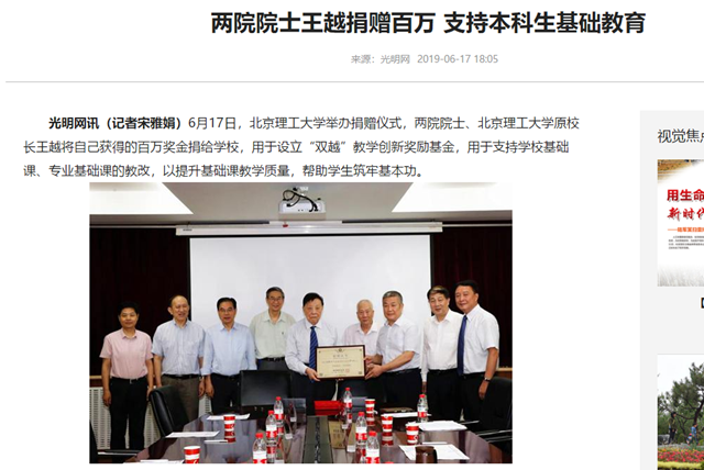 2018年教师节前夕,王越院士荣获首届“懋恂终身成就奖”及百万奖金。获奖后,王越当场表示,将捐出全部奖金设立专项基金,用于支持学校教育事业发展,特别是本科生的基础教育。