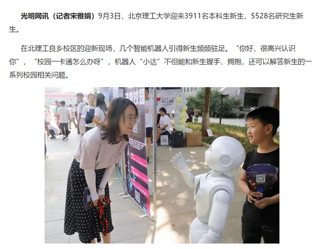 在北理工良乡校区的迎新现场,几个智能机器人引得新生频频驻足。“你好,很高兴认识你”,“校园一卡通怎么办呀”,机器人“小达”不但能和新生握手、拥抱,还可以解答新生的一系列校园相关问题。