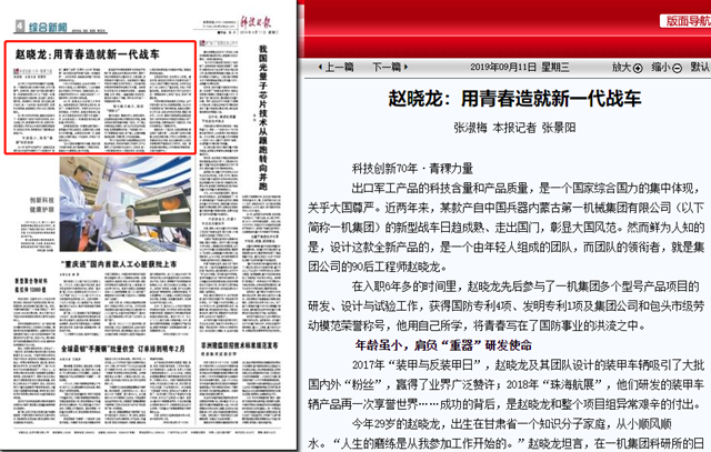 在入职6年多的时间里,赵晓龙先后参与了一机集团多个型号产品项目的研发、设计与试验工作,获得国防专利4项、发明专利1项及集团公司和包头市级劳动模范荣誉称号,他用自己所学,将青春写在了国防事业的洪流之中。