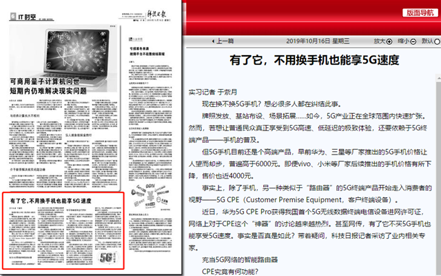 近日,华为5G CPE Pro获得我国首个5G无线数据终端电信设备进网许可证,网络上对于CPE这个“神器”的讨论越来越热烈。甚至网传,有了它不买5G手机也能享受5G速度。事实是否真是如此?带着疑问,科技日报记者采访了业内相关专家。