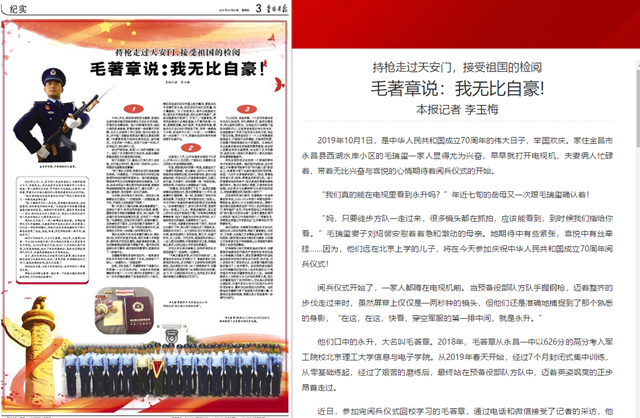 近日,参加完阅兵仪式回校学习的毛著章,通过电话和微信接受了记者的采访,他说:“身穿军装,手持钢枪走过天安门,接受祖国的检阅,我无比自豪。”