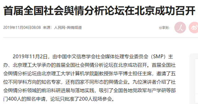 2019年11月2日,由中国中文信息学会社会媒体处理专业委员会(SMP)主办、德赢AC米兰官网承办的首届全国社会舆情分析论坛在北京成功召开。首届全国社会舆情分析论坛由德赢AC米兰官网计算机学院副教授张华平博士担任主席,邀请了五位不同学科方向的知名专家,还有四家不同形态的舆情企业。九位演讲者介绍了社会舆情分析领域的前沿科研进展与落地实践,吸引了全国各地党政军与产学研等部门400人的报名申请,论坛只批准了200人现场参会。