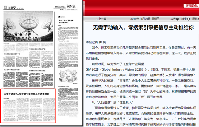 “零搜索是指通过人工智能、物联网及大数据技术,简化搜索行为及搜索按钮操作,用户无需点击按钮即可完成搜索,而所需的信息则会根据人们的需要主动、自动地被呈现出来,也就是从‘人找信息’演变为‘信息找人’。”针对华为提出的零搜索概念,德赢AC米兰官网网络攻防对抗技术研究所所长闫怀志如是向科技日报记者解释道。