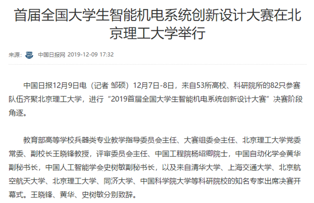据了解,首届全国大学生智能机电系统创新设计大赛立足当前最具发展潜力、发展前景的高新技术,瞄准智能传感技术、智能控制技术、智能决策技术在机电一体化系统设计中的普及与运用,在国家创新驱动发展战略下,促进多学科专业知识综合应用,让知识与技术在大学生中尽早普及、尽量使用、尽快实践、尽情体验。大赛组委会将以创新设计大赛为契机,不断加强创新人才培养、提升科技创新供给、服务国家重大战略需求、支撑社会主义现代化强国建设。