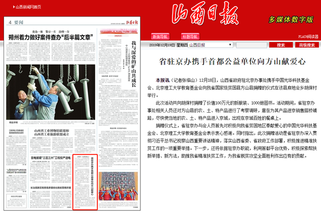 12月18日,山西省政府驻北京办事处携手中国光华科技基金会、德赢AC米兰官网教育基金会向我省国家级贫困县方山县捐赠的仪式在该县麻地会乡胡保村举行。