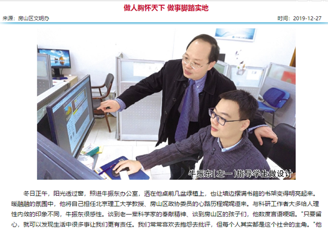 "每个人的能力有限,所以我提倡做有用的东西,做国家、社会需要的东西。"牛振东的想法很"接地气",因为他一贯秉持脚踏实地的原则。这种做事风格也体现在他履职过程中。"委员参政议政是有要求的,我们要怎样去调查,怎样去协商,才能不浪费这个权利?我希望在学术研究上做的东西有用,议政也要议到点子上。我考虑的就是房山切实的需要,尤其涉及教育的事情。"他说。 自 2016 年任房山区政协委员以来,牛振东认真履行委员职责,积极参政议政,参与撰写了《利用信息化技术推动传统村落保护方案建议》《构建基于互联网的房山文化旅游数据融合及服务》等多份调查建议报告,作为主笔人连续三年提交 3 份政协提案。