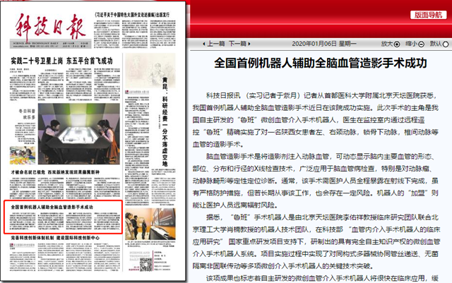记者从首都医科大学附属北京天坛医院获悉,我国首例机器人辅助全脑血管造影手术近日在该院成功实施。此次手术的主角是我国自主研发的“鲁班”微创血管介入手术机器人,医生在监控室内通过远程遥控“鲁班”精确实施了对一名陕西女患者左、右颈动脉,锁骨下动脉,椎间动脉等血管的造影手术。