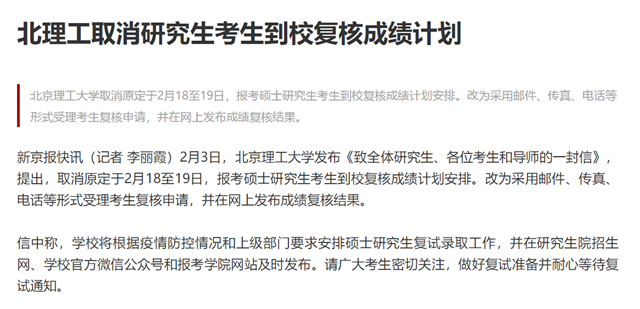 编辑:吴楠 审核:王征 阅读次数:原文标题:北理工取消研究生考生到校复核成绩计划